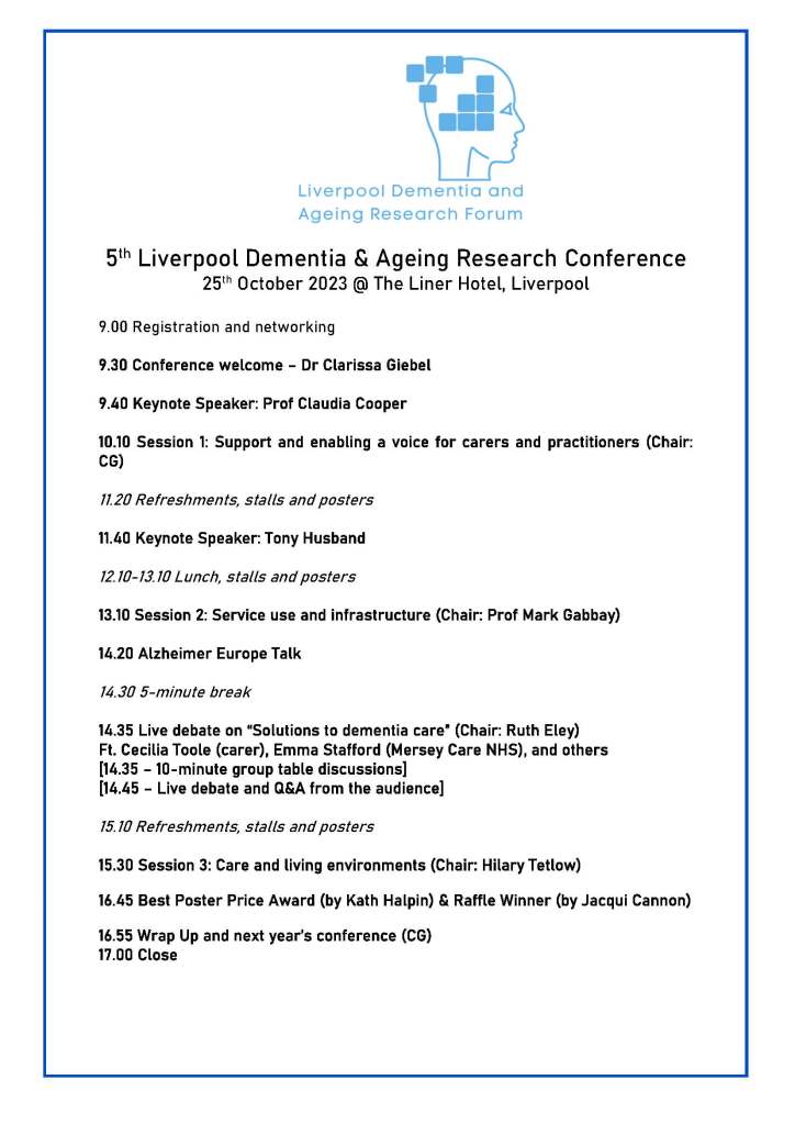 This year’s theme centres around “From research to practice: Solutions to improve dementia and ageing care”. We are looking forward to receiving your abstracts, whether you are an academic, student, health or social care professional, Third Sector, carer or person with dementia – we want to hear about your latest research and service models to improve care!